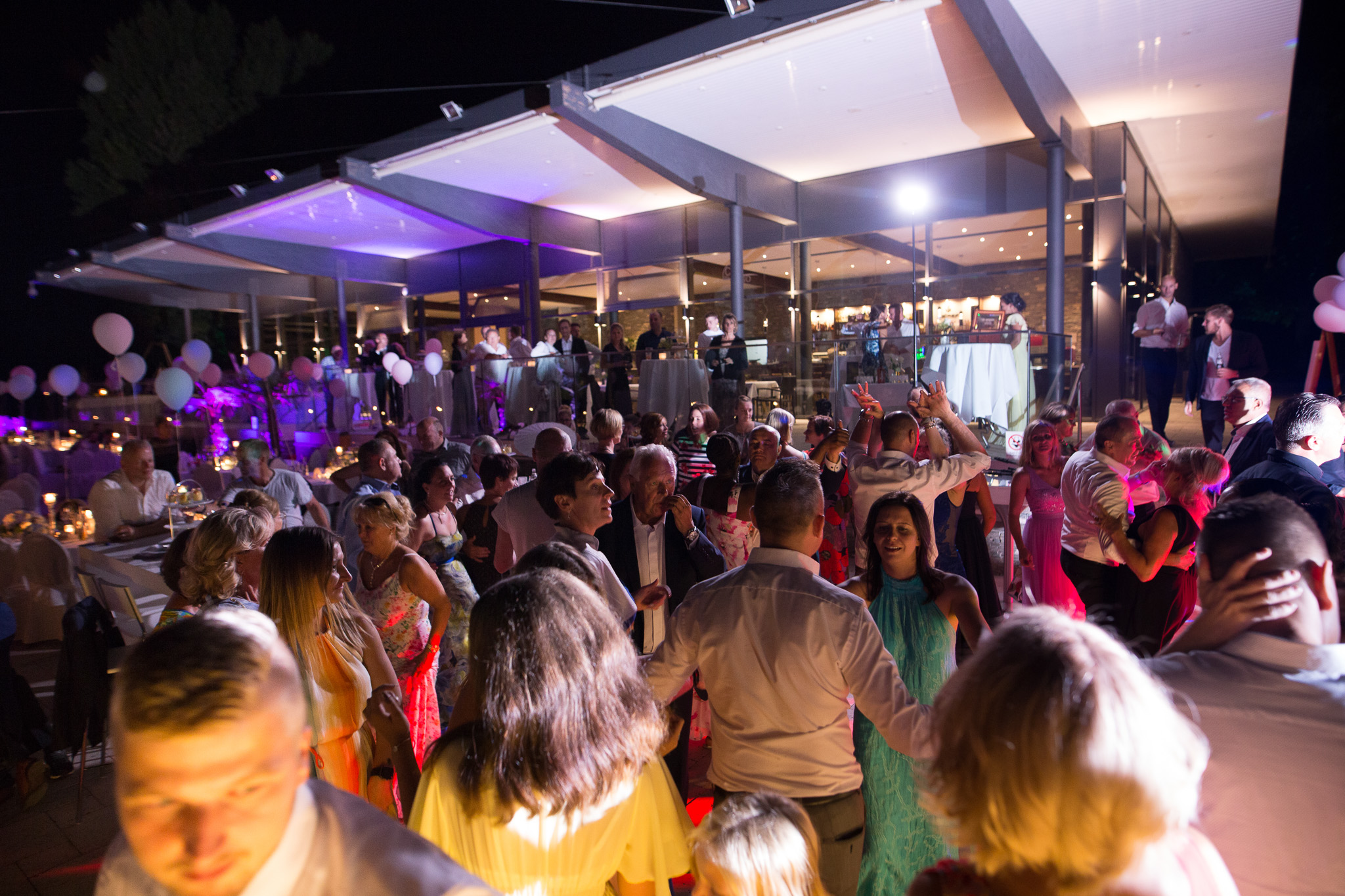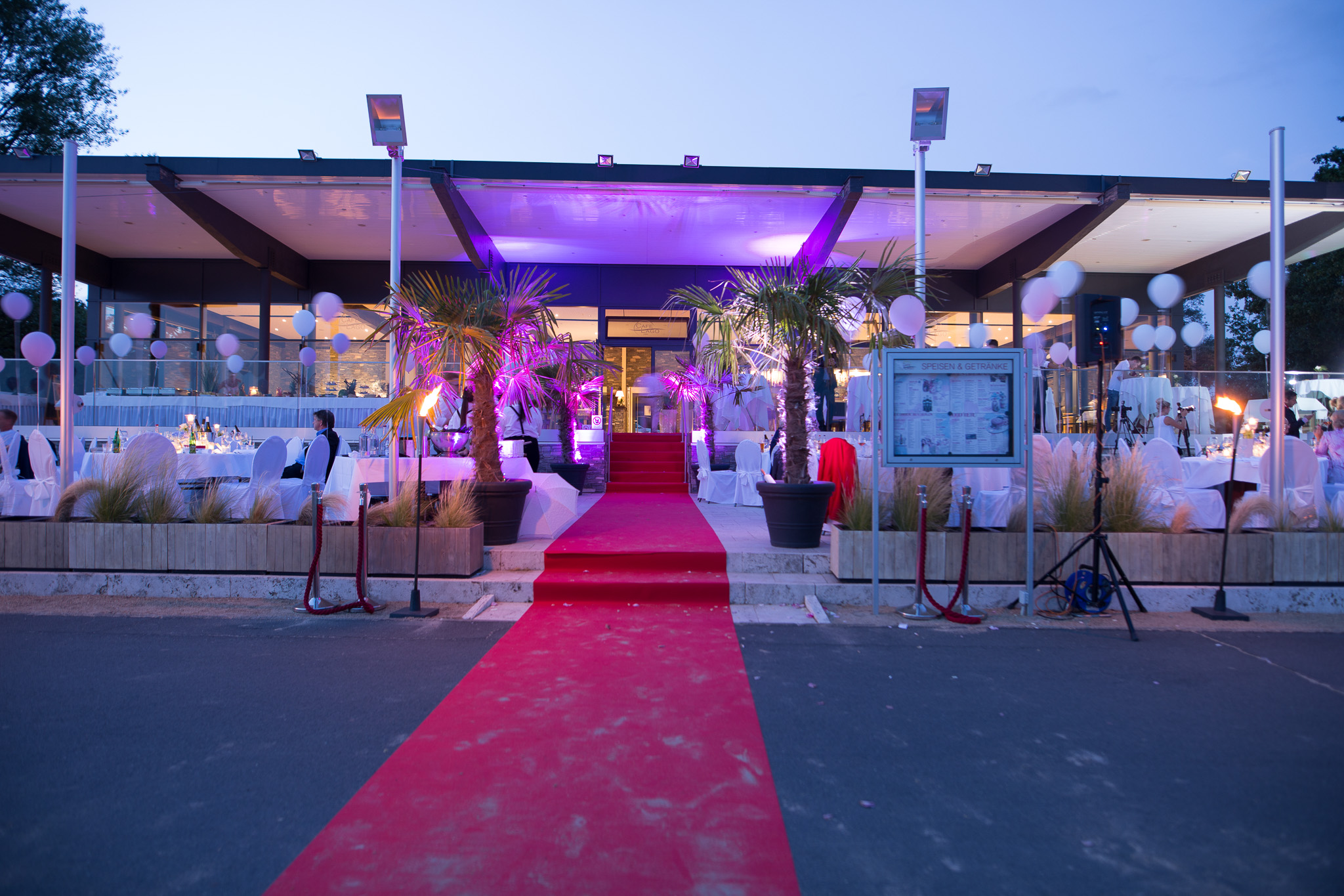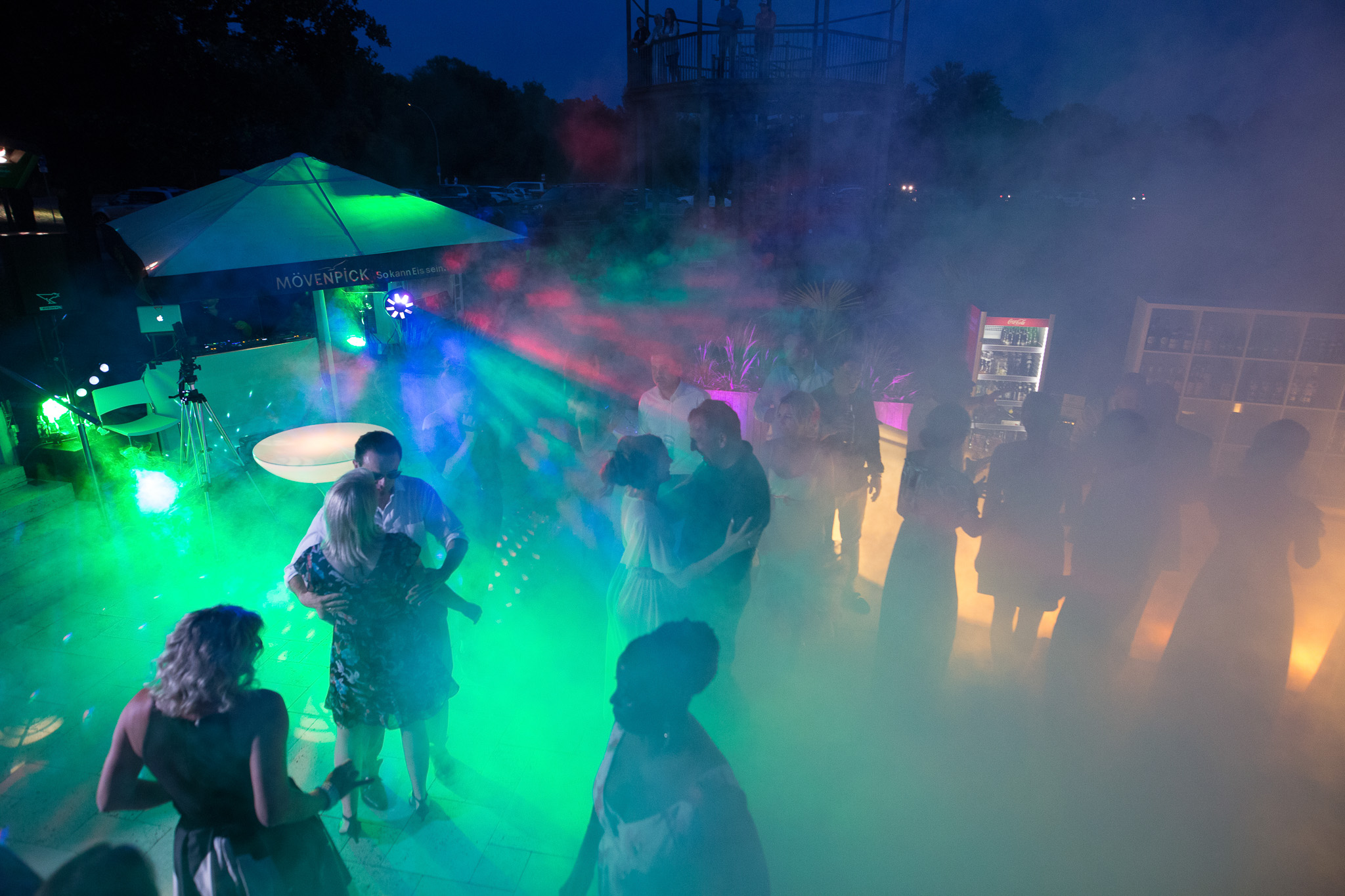 Nach dem kulinarischen Genuss verwandelte sich der Abend in ein Fest der Musik und des Entertainments. Live-Musik begeisterte die Gäste, während eine LED Outdoor Bar für eine glamouröse Atmosphäre sorgte. Die gesamte Veranstaltung fand im Außenbereich statt, wobei das Wetter perfekt mitspielte. Bei angenehmen 30 Grad und strahlendem Sonnenschein konnte die Hochzeitsgesellschaft einen unvergesslichen Tag im Café del Lago genießen.